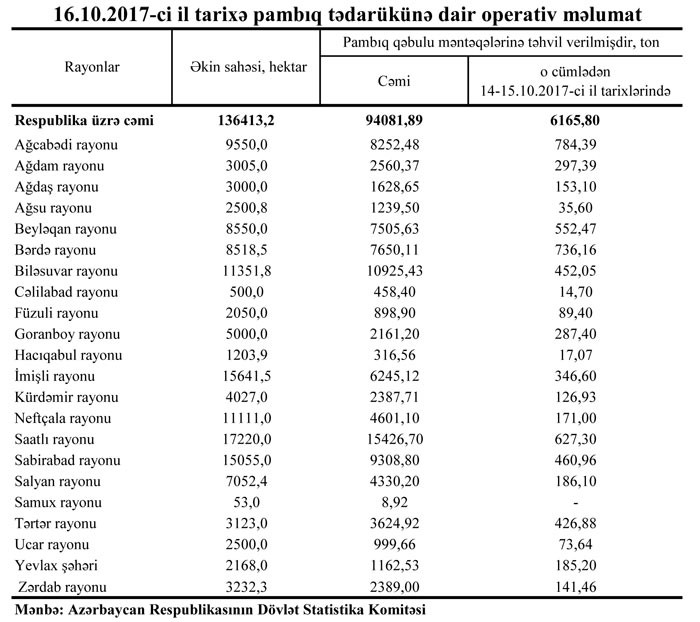 Dövlət Statistika Komitəsindən bildiriblər ki, oktyabrın 14-15-də 6165,80 ton pambıq tədarük olunub.
