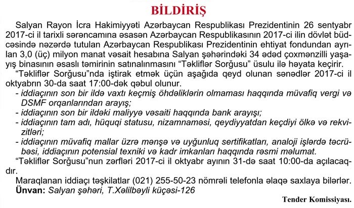 Salyan rayon İcra Hakimiyyəti tikinti şirkəti axtarır