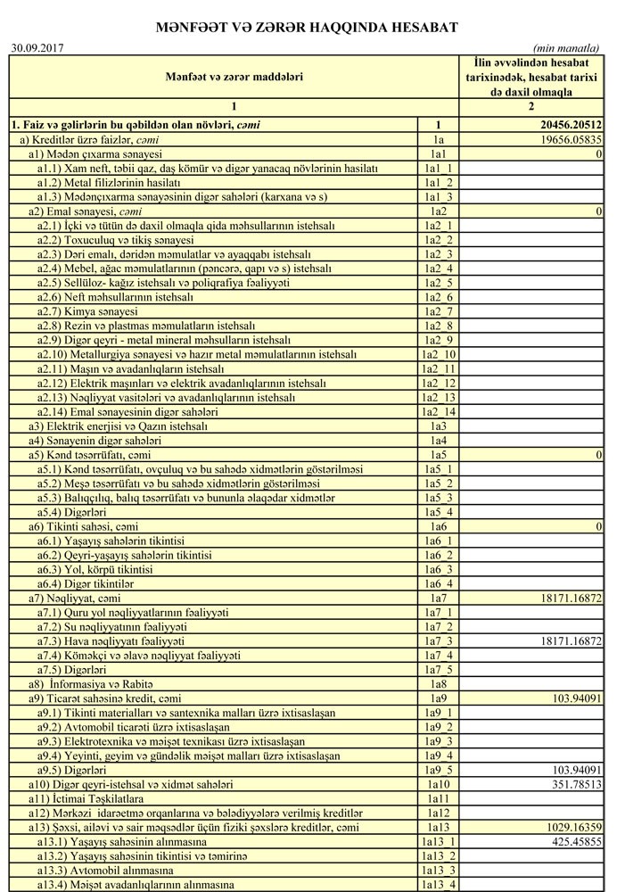 Son 9 ayda müştrilərə verilən kreditlər 388 milyon 332.7 min manatdan 369 milyon 797 min manata geriləyib. Bankda depozitlər isə cüzi - 170 milyon 44.9 min manatdan 170 milyon 980.2 min manata qalxıb. Əhalinin əmanətləri (fiziki şəxslərin müddətli depozitləri) isə 120 milyon 381 min manatdan 102 milyon 97 min manata düşüb.