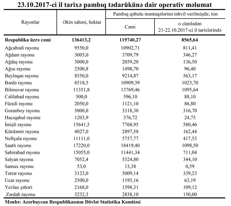 Dövlət Statistika Komitəsindən bildiriblər ki, oktyabrın 21-22-də 8565,64 ton pambıq tədarük olunub.