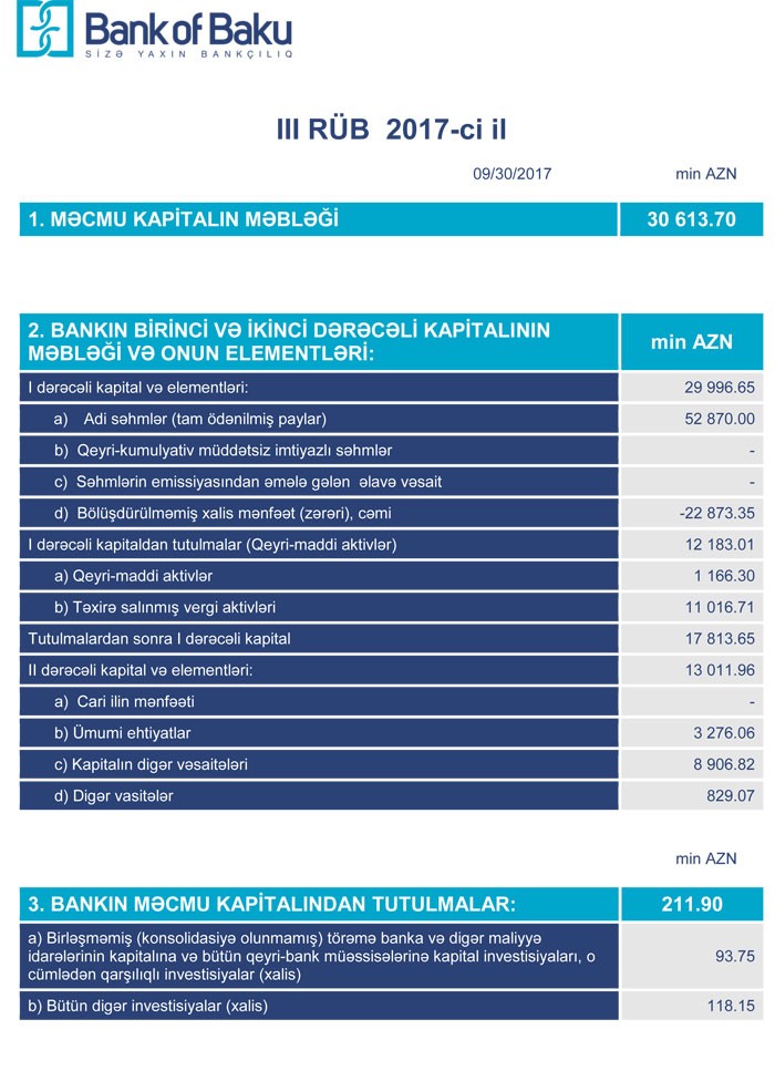 30 Sentyabr 2017-ci il tarixində Bankın məcmu kapitalı 30 milyon 613 min manat təşkil edib.