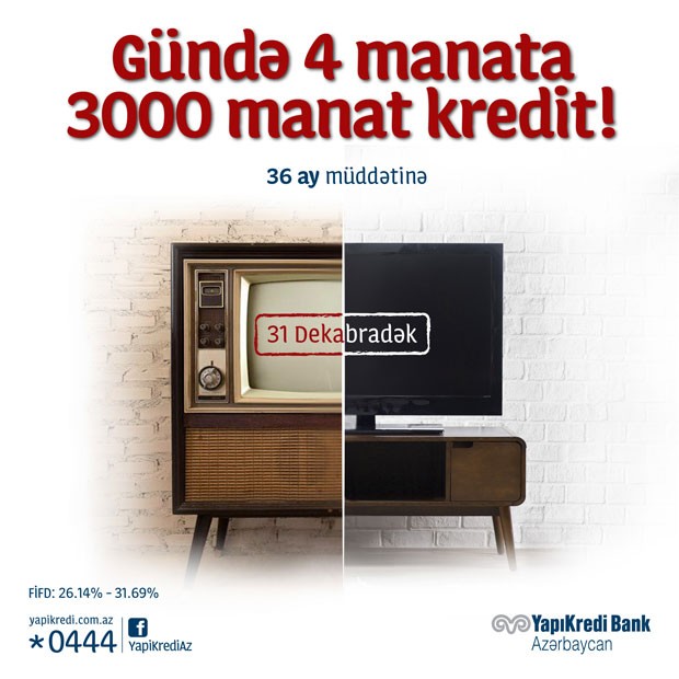 Qeyd edək ki, kampaniya 31.12.17 tarixinə qədər keçəriləcək. Günlük 4 manat ödənişlə 3000 AZN-lik kredit - illik 25%-lə, 36 ay müddətinə, kreditləşəcək vəsaitin standart aylıq ödənişlərini günlük (30 gün uzərindən) hesablanmışdır.