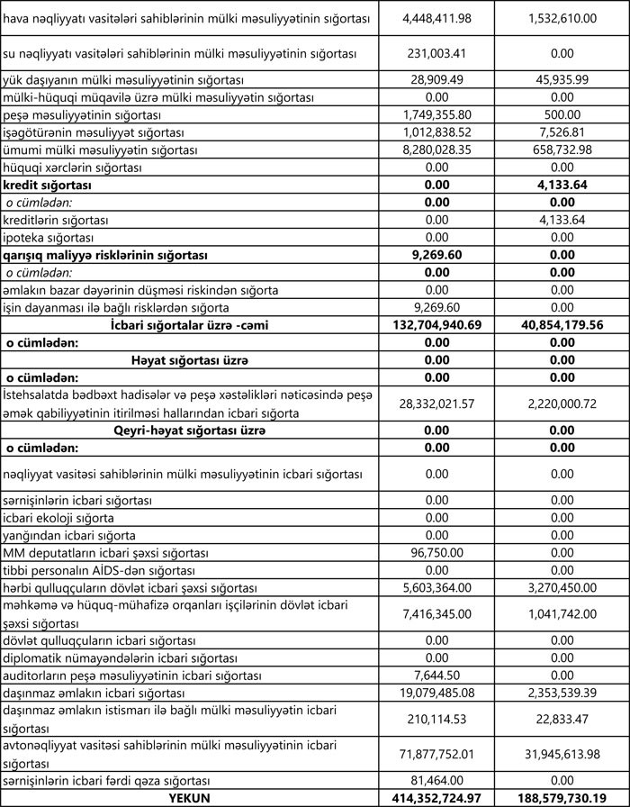 İcbari sığorta bazarındakı göstəricilərdə isə azalma trendi müşahidə edilib. Belə ki, cari ilin 9 ayı ərzində toplanan sığorta haqları 132 milyon 705 min manatdır ki, bu da ötən ilin müvafiq dövrü ilə müqayisədə 6 milyon 846 min manat daha azdır. İcbari növlər üzrə sığorta ödənişləri ötən ilin müvafiq dövrü ilə müqayisədə 694 min manat azalaraq 40 milyon 854 min manat təşkil edib.