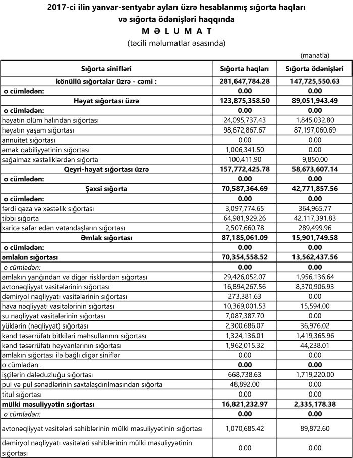 2017-ci ilin yanvar-sentyabr ayları ərzində sığorta şirkətləri və sinifləri üzrə hesablanmış sığorta haqları və ödənişlərə dair ətraflı məlumatlar sığorta bazarının icmal göstəricilərində öz əksini tapıb.