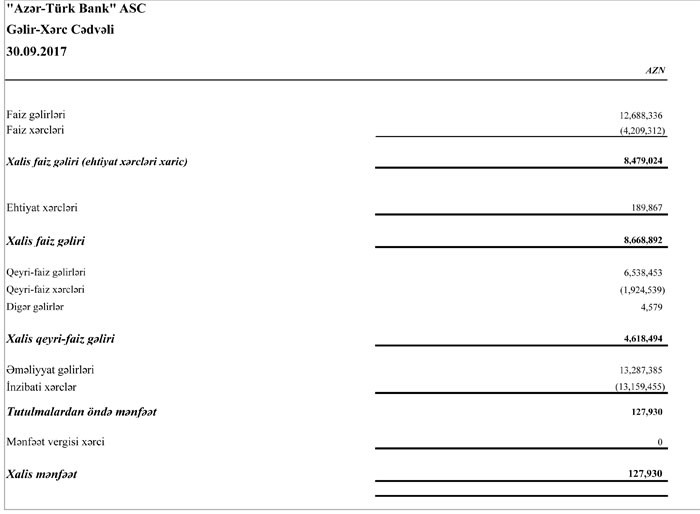 Bütün xərclər (19 milyon 292 min manat) çıxıldıqdan sonra Bankın 127 min 930 manat xalis mənfəəti qalıb. “AzərTürkBank” 2016-cı ili 7 milyon 338 min manat xalis mənfəətlə başa vurmuşdu.