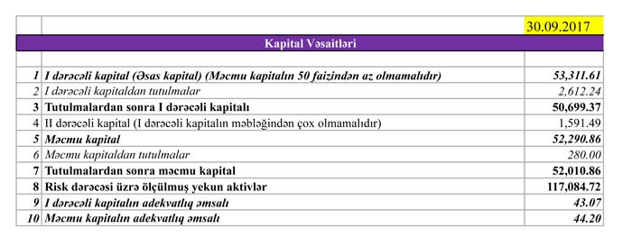 30 Sentyabr 2017-ci il tarixində “AzərTürkBank” 295 milyon 206 min manat cəmi aktivlərə, 241 milyon 766 min manat cəmi öhdəliklərə və 53 milyon 439 min manat cəmi balans kapitalına malik olub.