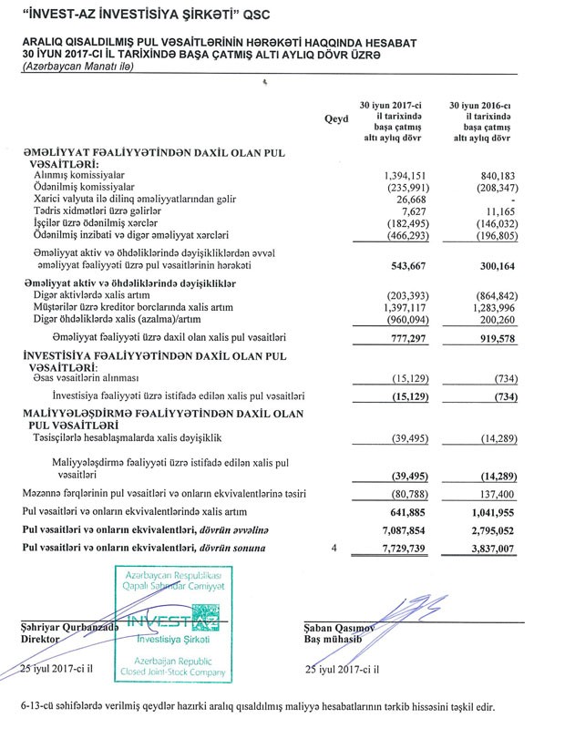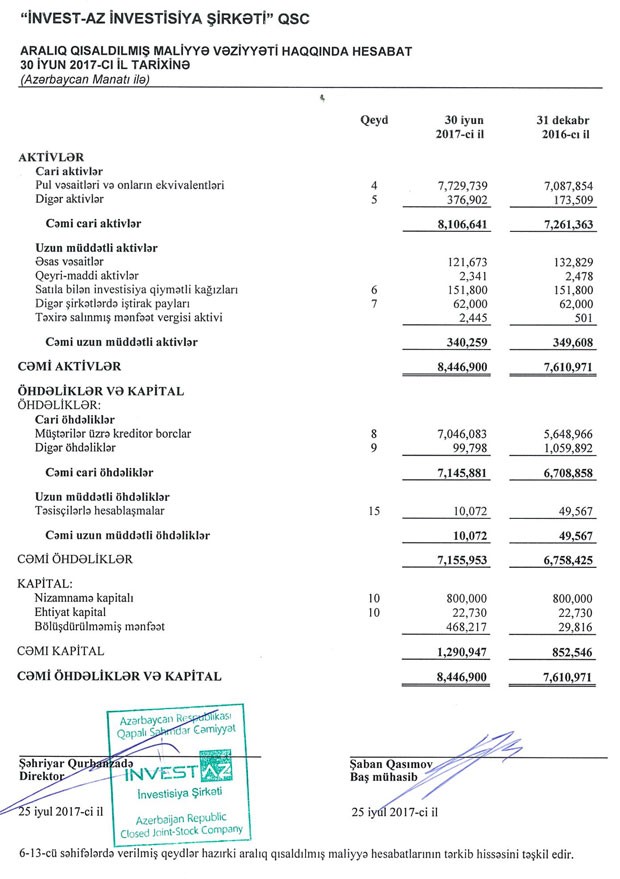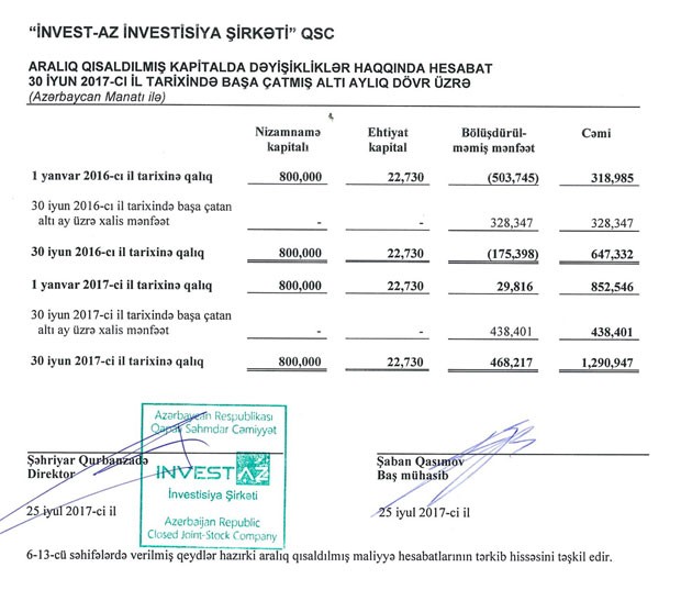 “İnvestAZ İnvestisiya Şirkəti” QSC 2017-ci ilin birinci yarısını 438 min 401 manat xalis mənfəətlə başa vurub.