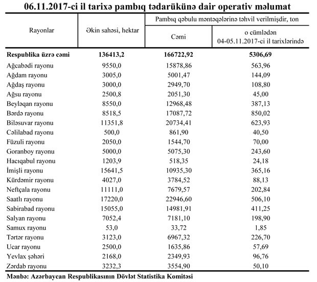 Dövlət Statistika Komitəsindən bildiriblər ki, ötən iki gündə 5306,69 ton pambıq tədarük olunub.