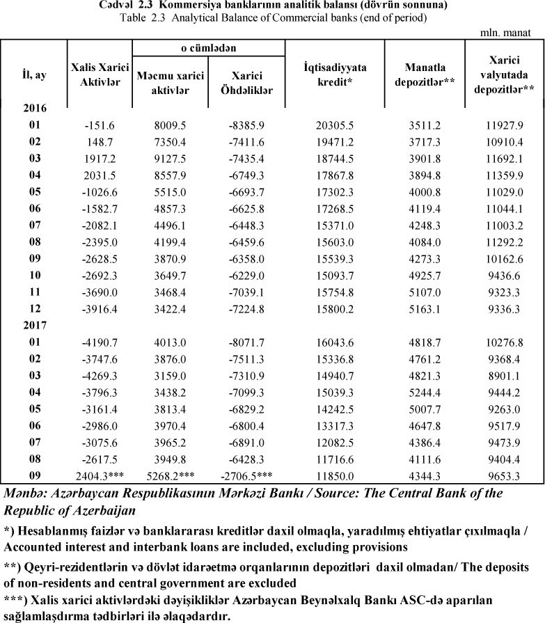 30 Sentyabr 2017-ci il tarixində kommersiya banklarının xarici öhdəlikləri 2 milyard 706.5 milyon manat təşkil edib. Bu, Avqustun sonu ilə müqayisədə 3 milyard 721.8 milyon manat azdır.