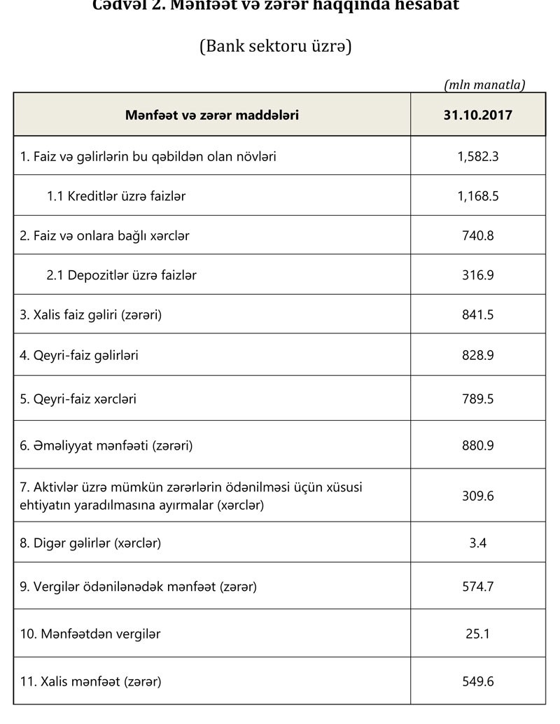 2017-ci il noyabrın 1-nə bank sektorunun xalis mənfəəti 549,6 milyon manat təşkil edib.