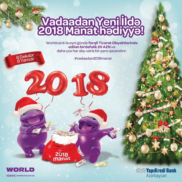 Belə ki, 2018-ci ilin gəlişi ilə əlaqədar olaraq Worldcard istifadəçiləri 2018 manat qazana bilərlər. Bunun üçün, sadəcə, Worlcard-la alış-veriş etmək kifayətdir. Şanslı qaliblərdən biri olub 2018 manat bal qazanmaq üçün Worldcard-la World Üzv Ticarət Obyektlərində 20 AZN və üzəri alış-veriş etmək gərəklidir.