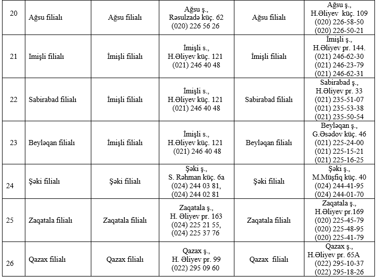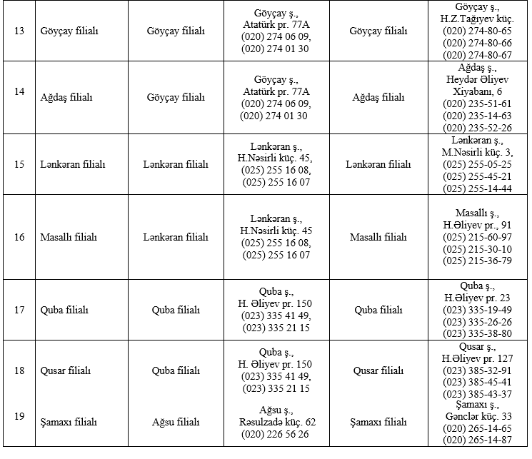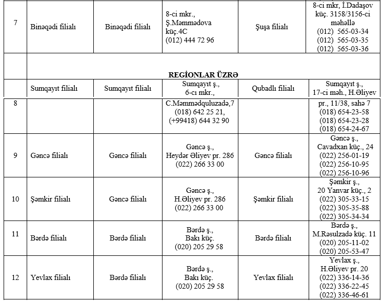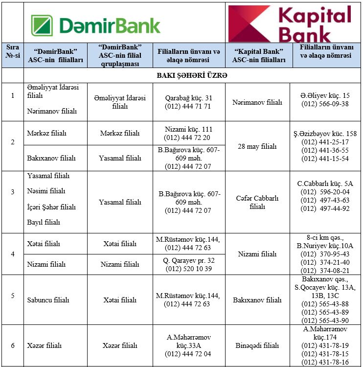 Aşağıdakı cədvələ uyğun olaraq qorunan əmanətçilər ləğv prosesində olan “DəmirBank” ASC-də əmanəti olduğu filialın qarşısında qeyd edilən “KapitalBank” ASC-nin filialına 1 fevral 2018-ci il tarixindən müraciət edərək, şəxsiyyətini təsdiq edən sənəd, əmanət müqaviləsi və doldurulmuş ərizələri əsasında kompensasiyalarını ala bilərlər.