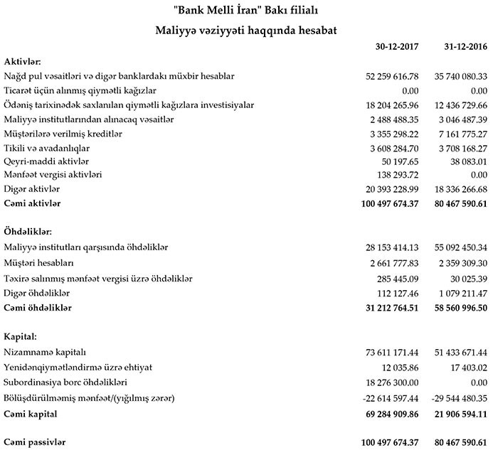 30-12-2017-ci il tarixinə "Bank Melli İran" Bakı filialının cəmi aktivləri 100 milyon 498 min manat, cəmi öhdəlikləri 31 milyon 213 min manat, cəmi balans kapitalı isə 69 milyon 285 min manat təşkil edib.