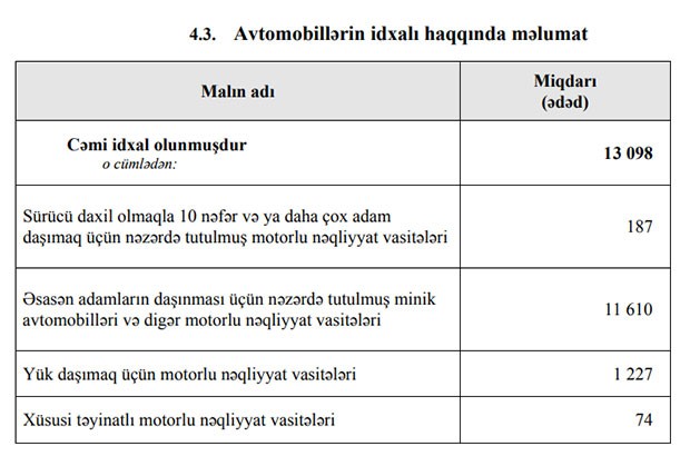 Qeyd edək ki, 2017-ci ilin 11 ayında Azərbaycana 9 828 ədəd avtomobil idxal olunmuşdu. Dekabrda avtomobil idxalı 3270 ədəd təşkil edib. İlin əvvəlində aylıq idxal 1000 ədədə çatmasa da, son aylar avtomobil idxalı 1000-1700 ədəd civarında olurdu. Dekabrda idxalın kəskin artması 2018-ci ilin yanvar ayından avtomobillərə daha yüksək gömrük rüsumlarının tətbiq ediləcəyinin elan edilməsilə bağlıdır.