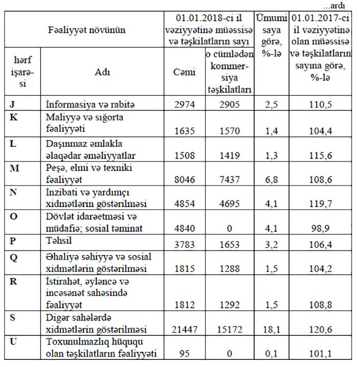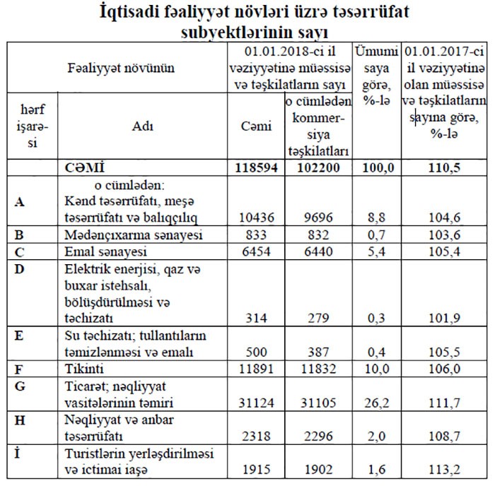 2017-ci il ərzində müəssisə və təşkilatların sayı 10,5 faiz artaraq, 2018-ci il yanvarın 1-i vəziyyətinə 118594 olmuşdur. Bu barədə “Marja”ya Dövlət Statistika Komitəsindən bildirilib.
