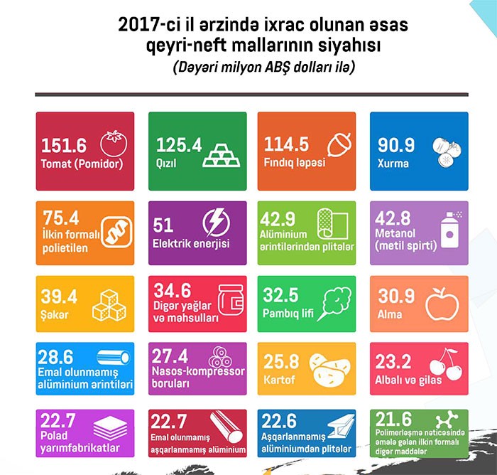 2017-ci il ərzində ixrac olunan qeyri-neft sektoru məhsulları arasında pomidor (tomat) birinci olmuşdur.