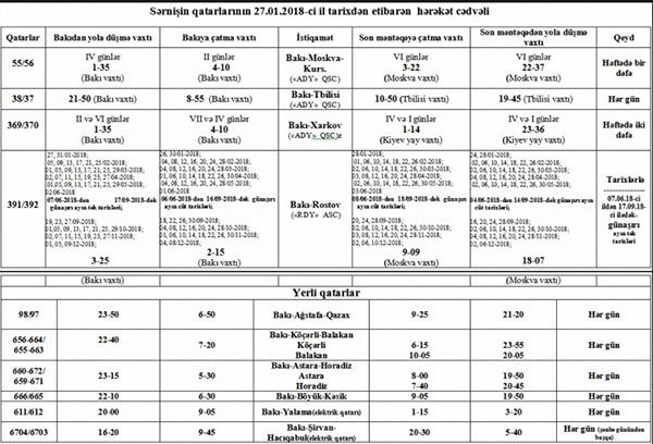 “Rusiya Dəmir Yolları” ASC tərəfindən sərnişin qatarlarının hərəkət cədvəllərində aparılan dəyişikliklərə əsasən, Rusiya Dəmir Yollarına məxsus heyətlə hərəkət edən 391/392 nömrəli Bakı-Rostov-Bakı sərnişin qatarının hərəkət cədvəli 27.01.2018-ci il tarixdən etibarən dəyişdirilir.