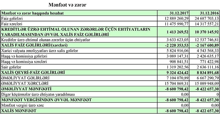 “Marja” xəbər verir ki, ötən il Bankın faiz gəlirləri 12 milyon 889 min manat, qeyri-faiz gəlirləri 10 milyon 233 min manat təşkil edib. Faiz, qeyri-faiz xərcləri və ehtiyatlara ayırma çıxıldıqdan sonra Bankın 7 milyon 104 min manat əməliyyat gəliri yaranıb. 15 milyon 704 min manat əməliyyat xərci, bankın ötən ili 8 milyon 601 min manat zərər ilə bağlamasına səbəb olub.
