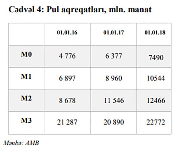 Manatla pul kütləsinin (M2) strukturunda nağd pul kütləsi, fiziki şəxslərin əmanətləri və hüquqi şəxslərin depozitləri fərqli dinamika nümayiş etdirmişlər. Belə ki, dövr ərzində nağd pul kütləsi 17.5%, fiziki şəxslərin manat əmanətləri 66.9% artmış, hüquqi şəxslərin manat depozitləri isə 16% azalmışdır.