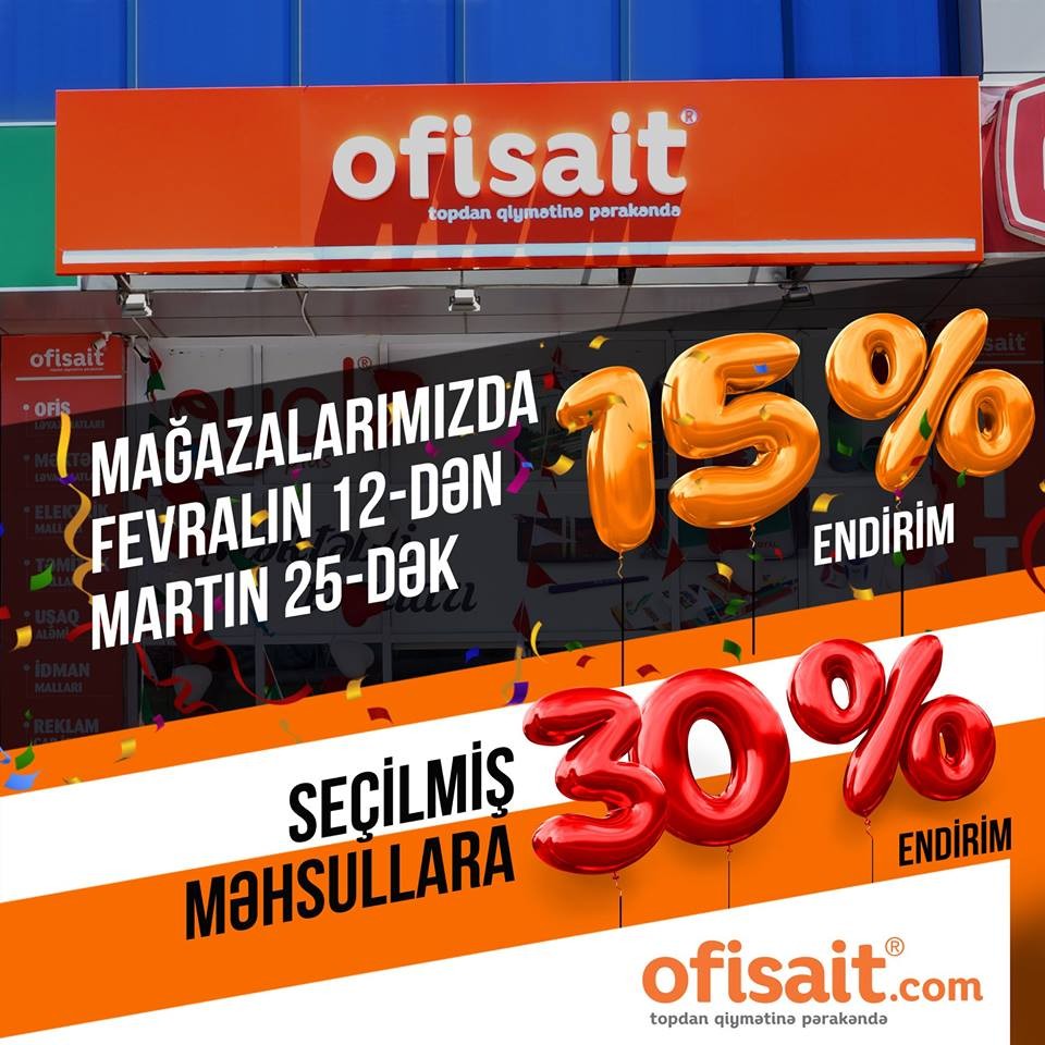 Fevralın 12-dən Martın 25-dək Ofisait mağazalar şəbəkəsində bütün məhsullara 15% ENDİRİM, seçilmiş məhsullara isə 30% ENDİRİM olunacaq. Bu fürsətdən siz də fafdalanın!