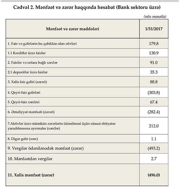 Banklar 2017-ci ilin yanvarında 496 milyon manat zərər etmişdilər, 2017-ci ili isə 883.6 milyon manat xais mənfəət ilə bağlamışdılar.
