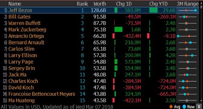 Siyahıya görə, Bezos 100 milyard dolların üzərində sərvətə malik yeganə ad ikən, Bill Qeyts 91.5 milyard dollar ilə ikinci sırada, Uorren Buffett isə 87.7 milyard dollar ilə üçüncü sırada yer alır.