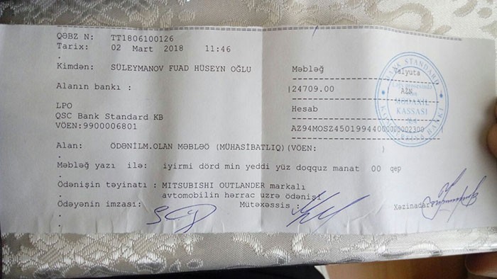 "Mən, Süleymanov Fuad Hüseyn oğlu 26.02.2018 ci il tarixində Əmanətlərin Sığortalanması Fondunun təşkil etdiyi hərracda ilkin qiyməti 18570 manat olan Mitsubishi Outlander markalı avtomobili 25638 manata almışam. Hərrac qaydalarına əsasən 5 iş günü ərzində lazımı sənədləri və ödənişi Əmanətlərin sığortalanması fonduna təqdim etmişəm. Lakin Əmanətlərin Sığortalanması Fondu öz öhdəliklərinin yerinə yetirmir. 04 May 2017-ci il tarixli qərarla təsdiqlənmiş hərrac qaydalarına əsasən alıcı və satıcı arasında müqavilə imzalandığı tarixdən 3 iş günündən gec olmayaraq alınan mal alıcıya təhvil verilməlidir. Müqavilə 06.03.2018 tarixində imzalanmışdır və avtomobil fiziki olaraq 06.03.2018 tarixində mənə təqdim edilmişdir. Lakin avtomobili öz adıma sənədləşdirmək üçün lazımı sənəd bu günədək mənə təhvil verilməmişdir. Hazırda avtomobili istifadə etməyim mümkün deyil. Eyni zamanda Əmanətlərin Sığortalanması Fondu avtomobili öz adıma necə sənədləşdirməyim haqqında mənə heçbir yazlı və ya şifahi təlimatlar verməmişdir, əksinə mən Əmanətlərin Sığortalanması Fondunun əməkdaşlarına sənədləşdirmə prosesinin DYP tərəfindən hansı tələblərlə baş verməsi haqqnda məlumat vermişəm. Bütün bu yuxarıda sadalananlar Əmanətlərin Sığortalanması Fondunun biganəliyi, səriştəsizliyi və məsuliyyətsizliyi haqqında xəbər verir. Qeyd edim ki, 26.02.2018 tarixində keçirilən hərracın gedişatı haqqında 28.07.2018 tarixində fondun icraçı direktoru Vuqar Abdullayevə şikayət mətubu ünvanlamışam, həmin məktuba bugünə qədər cavab almamışam və eyni zamanda Əmanətlərin Sığortalanması Fondu avtomobili sənədləşdirməyim üçün zəruri olan sənədi nə zaman təqdim edəcəkləri haqqlnda da məlumat vermir".