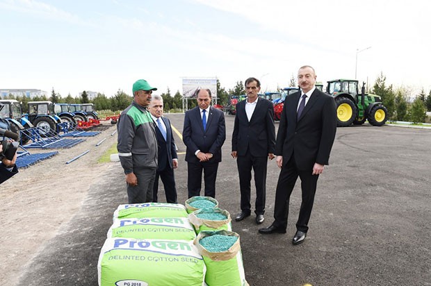 Şadam ki, Bərdə rayonunda pambıqçılığın şöhrəti bərpa olunur. Vaxtilə böyük işlər görülmüşdü. Siz yaxşı bilirsiniz ki, 1970-1980-ci illərdə Ulu Öndərin təşəbbüsü ilə ölkəmizdə, o cümlədən Bərdə rayonunda pambıqçılıq geniş vüsət almışdı. Bərdə o vaxt pambıqçılıq sahəsində aparıcı rayonlardan biri idi. O vaxt əlbəttə ki, Azərbaycanda daha çox pambıq yığılırdı, 1981-ci ildə təxminən bir milyon tona çatmışdı. Təkcə Bərdə rayonu o vaxt 120 min ton pambıq təhvil verirdi. Ancaq əfsuslar olsun ki, son illər ərzində pambıqçılıq tənəzzülə uğramışdı. Ona görə, ciddi tədbirlər görüldü, dövlət bu işə lazımi dəstəyi göstərdi və qısa müddət ərzində pambıqçılıq sürətlə inkişaf etməyə başlamışdır, o cümlədən Bərdə rayonunda. Məndə olan məlumata görə, 2015-ci ildə Bərdədə cəmi 3 min ton pambıq yığılmışdır. Keçən il isə 22 min 400 ton. Görülən tədbirlər nəticəsində iki il ərzində pambığın tədarükü təxminən 7-8 dəfə artmışdır. Bax, bu texnika təzə texnikadır. Özü də bu traktorlar Azərbaycan istehsalıdır. Vaxtilə biz bu istehsalı “Belarus” şirkəti ilə birlikdə Gəncə şəhərində qurmuşuq. İndi də fermerlərin tələbatını yerli texnika ilə tam ödəyirik. Digər qoşqular, bunlar xaricdən gətirilib, gübrələr indi lazımi həcmdə verilir, suvarma işləri təşkil olunur. Yəni, pambıqçılığın inkişafı üçün bütün lazımi tədbirlər görülür. Yerli və mərkəzi icra orqanları, fermerlər, şirkətlər bu işlərdə çox fəal çalışırlar. Əlbəttə ki, vətəndaşlar üçün yeni iş yerləri yaradılır.