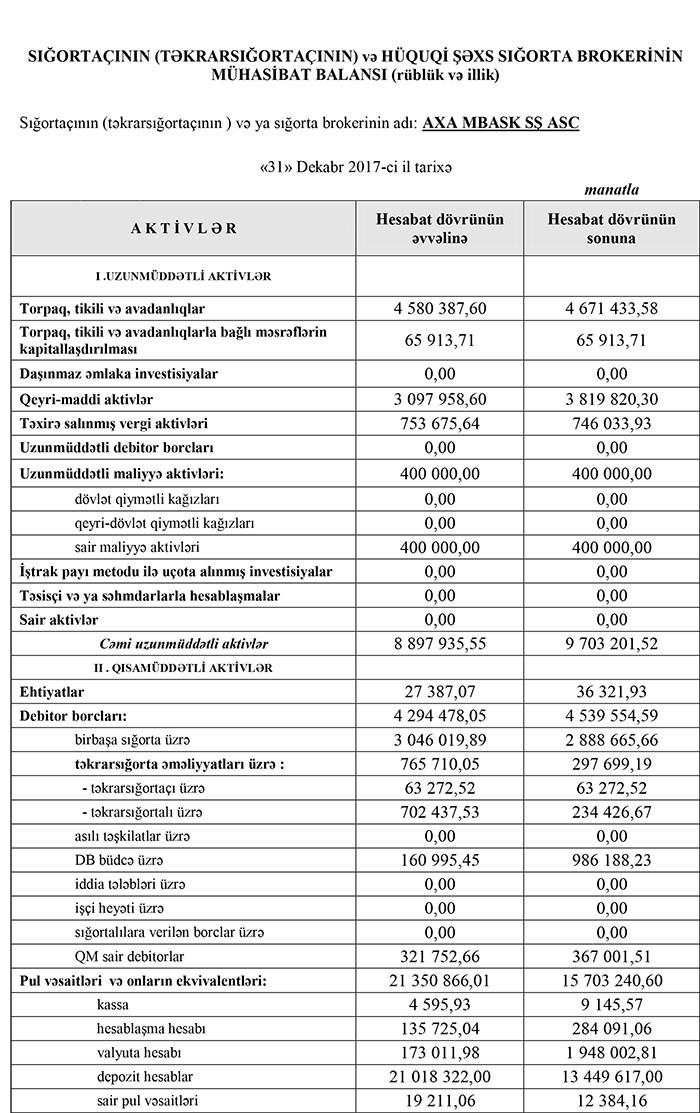 2017-ci il ərzində "AXA MBASK" Sığorta Şirkətinin aktivləri 38 milyon 291 min manatdan 33 milyon 770 min manata düşüb.