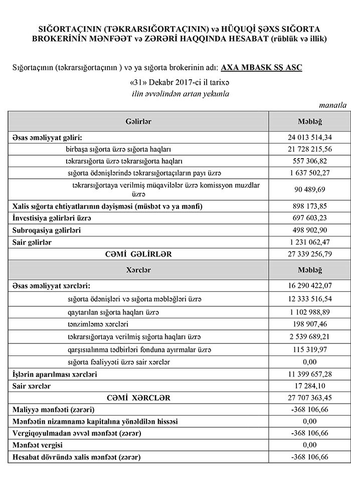 “AXA MBASK” Sığorta Şirkəti ASC 2017-ci ili 368 min manat zərər ilə başa vurub.