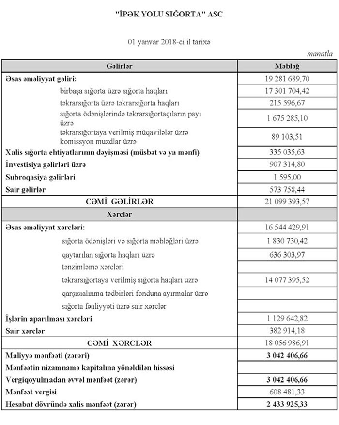 “Marja” şirkətin maliyyə hesabatlarına istinadən xəbər verir ki, ötən il “İpək Yolu Sığorta”nın cəmi gəlirləri 21 milyon 99 min manat, xərcləri isə 18 milyon 56 min manat təşkil etmiş, 3 milyon 42 min manat əməliyyat mənfəətindən 608,5 min manat mənfəət vergisi ödənilmişdir.