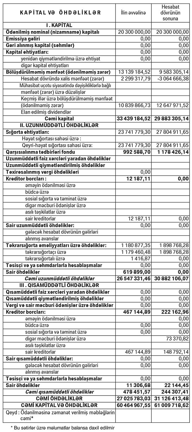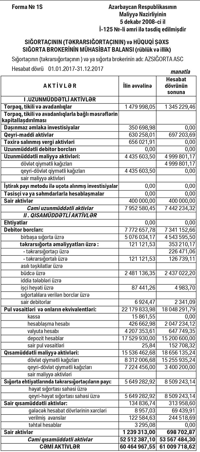 31 Dekabr 2017-ci il tarixində “Azsığorta” 61 milyon 9 min manat cəmi aktivlərə, 29 milyon 883 min manat cəmi kapitala və 31 milyon 126 min manat cəmi öhdəliklərə malik olub. Şirkət 31 Dekabr 2016-cı il tarixində 60 milyon 464 min manat cəmi aktivlərə, 33 milyon 439 min manat cəmi kapitala və 27 milyon 25 min manat cəmi öhdəliklərə malik idi. Kapitalın azalması ötən il yaranmış zəər ilə bağlıdır.