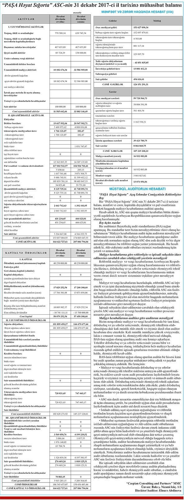 “PAŞA Həyat Sığorta” ASC-nin 31 dekabr 2017-ci il tarixinə mühasi̇bat balansını mətbuatda dərc etdirib.
