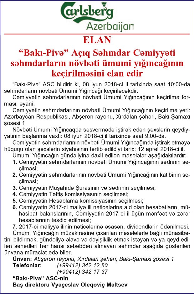 08 İyun 2018-ci il tarixində "Bakı-Pivə" ASC səhmdarlarının növbəti ümumi yığıncağı keçiriləcək.