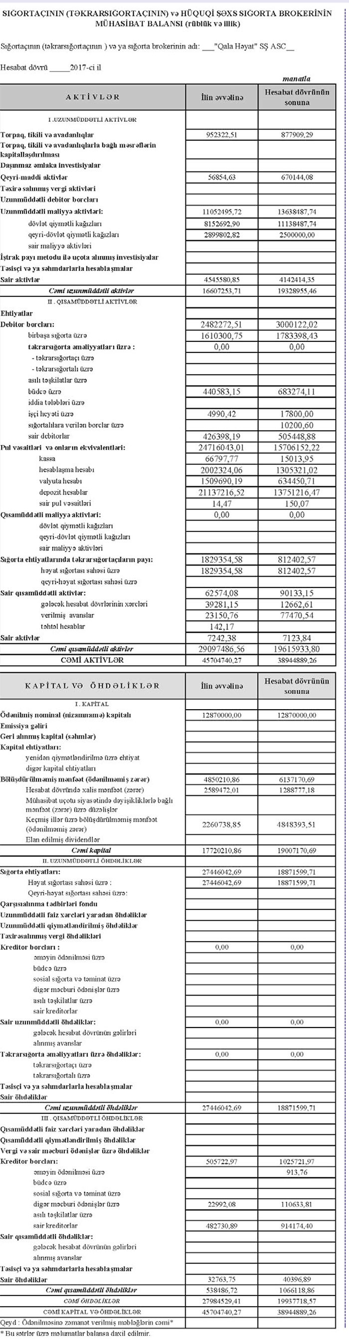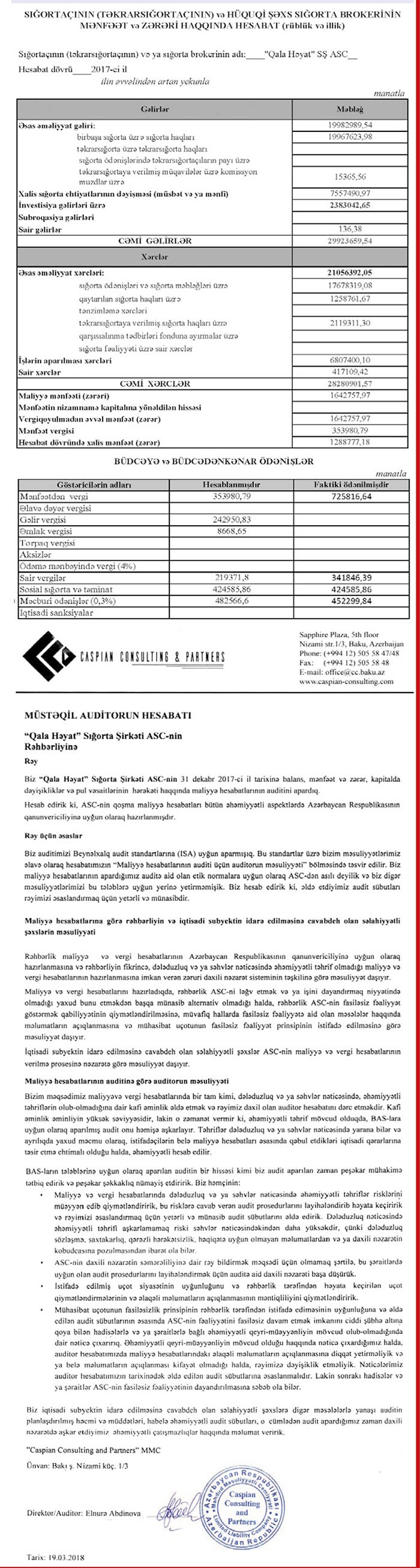 Azərbaycanda 3 həyat sığortası şirkətindən biri olan "Qala Həyat" Sığorta Şirkəti 2017-ci ili 1 milyon 289 min manat xalis mənfəətlə başa vurub. Şirkət 2016-cı ili 2 milyon 589 min manat xalis mənfəətlə bağlamışdı. Beləliklə, ilik müqayisədə şirkətin xalis mənfəəti 2 dəfə azalıb.