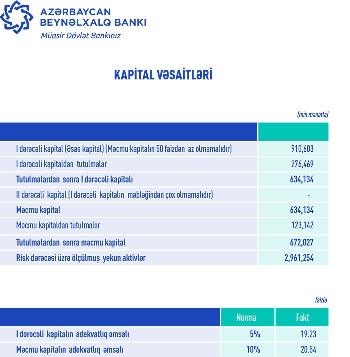 Bank ötən ilin sonunda 8 milyard 695 milyon manat cəmi aktivlərə, 7 milyard 746 milyon manat cəmi öhdəliklərə və 948 milyon 186 min manat cəmi kapitala malik idi.