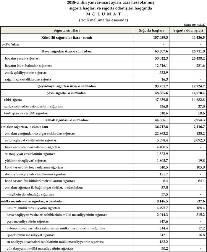 2018-ci ilin yanvar-mart ayları ərzində ölkədə fəaliyyət göstərən 21 sığorta şirkəti tərəfindən 193.1 milyon manat məbləğində sığorta haqları toplanmış, 60.3 mln. manat məbləğində sığorta ödənişi aparılmışdır.
