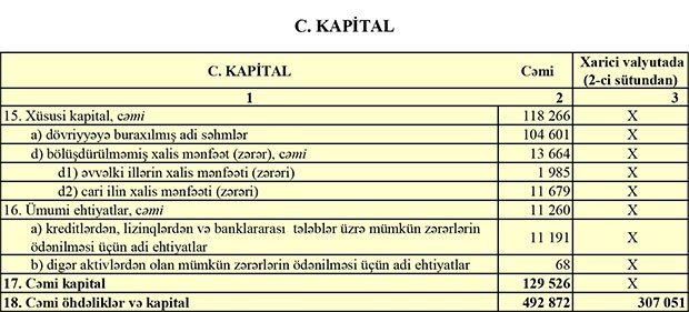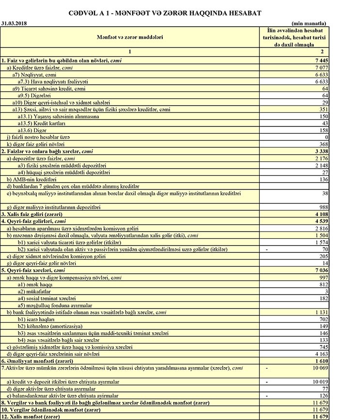 İlk rübdə, gəlirlərdən xərclər çıxıldıqdan sonra Bankın 1 milyon 610 min manat əməliyyat mənfəəti qalıb.Lakin Bankın kredit və depozit itkiləri üzrə ötən illər yaratdığı ehtiyatların 10 milyon 19 min manatı gəlirə çevrildiyindən (azad olduğundan) Bankın xalis mənfəəti 11 milyon 679 min manata yüksəlib.