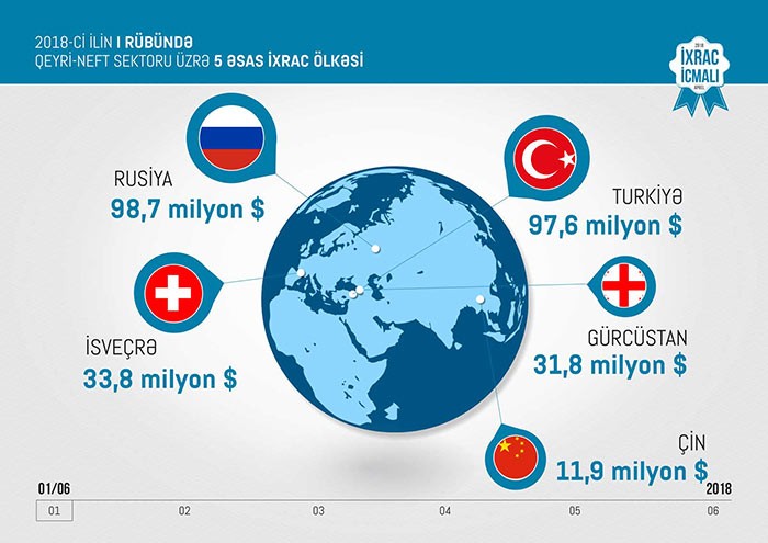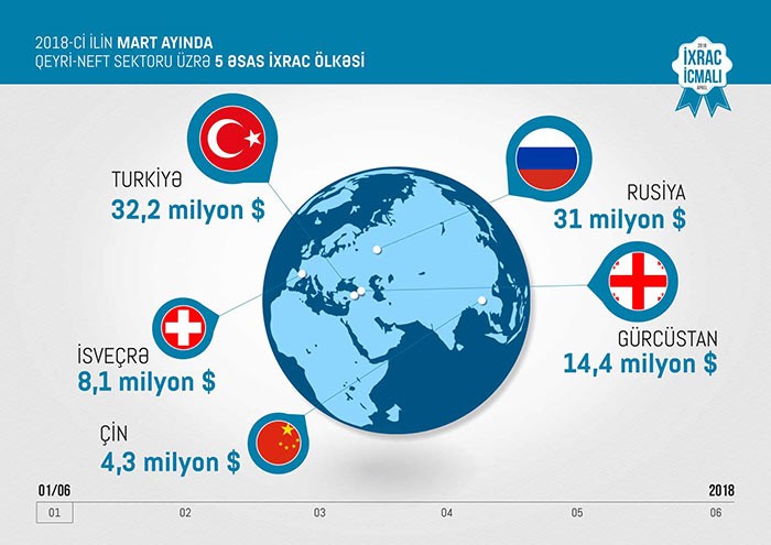 Cari ilin yanvar-mart ayları ərzində Rusiyaya 98,7 milyon, Türkiyəyə 97,6 milyon, İsveçrəyə 33,8 milyon, Gürcüstana 31,8 milyon və Çinə 11,9 milyon ABŞ dolları dəyərində qeyri-neft sektoruna aid mal ixrac olunub.