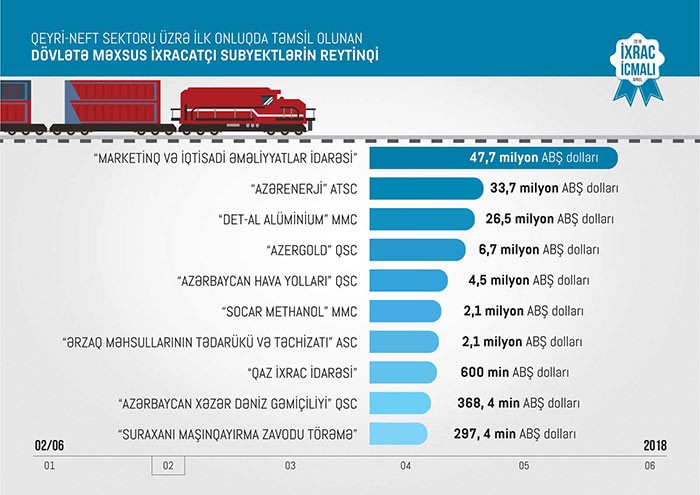 Dövlət Statistika Komitəsinin məlumatına əsasən 2018-ci ilin I rübü ərzində ixrac olunan qeyri-neft sektoru məhsulları arasında elektrik enerjisi (33,9 milyon ABŞ dolları) birinci, qızıl (30,9 milyon ABŞ dolları) ikinci, xüsusi kütləsi 0,94-dən az olan ilkin formalı polietilen (26,3 milyon ABŞ dolları) üçüncü olub.