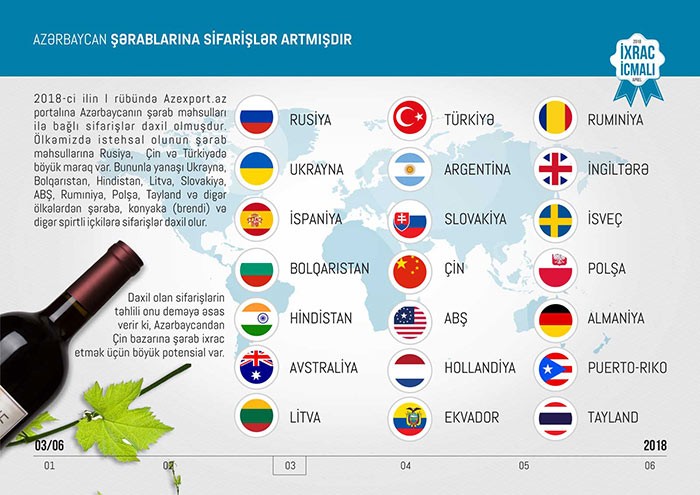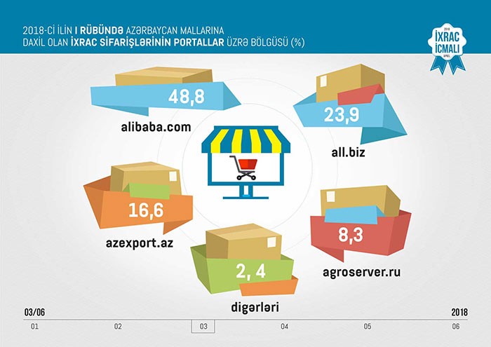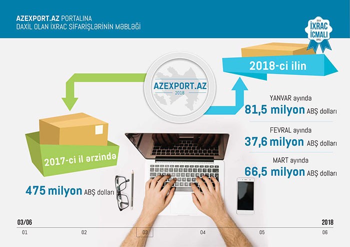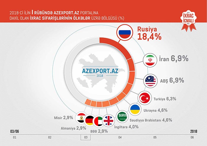 “İxrac İcmalı”nda 2018-ci ilin yanvar-mart ayı ərzində Azexport.az portalına daxil olan ixrac sifarişləri barədə də məlumat verilib. Göstərilib ki, 2018-ci ilin I rübündə 185,6 milyon ABŞ dolları məbləğində ixrac sifarişi daxil olub. Cari ilin mart ayı ərzində Azexport.az portalına 66,5 milyon ABŞ dolları məbləğində ixrac sifarişləri daxil olub. Ümumilikdə isə 2017-ci ilin yanvar ayından 2018-ci ilin 31 mart tarixinə kimi Azexport.az portalına dünyanın 90 ölkəsindən daxil olan ixrac sifarişlərinin dəyəri 660,6 milyon ABŞ dolları təşkil edib.