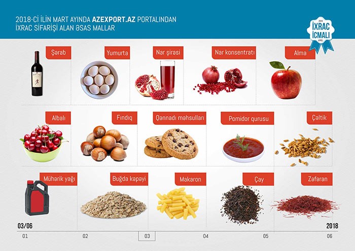 Daxil olan sifarişləri məhsullar üzrə təhlil etdikdə məlum olub ki, cari ilin mart ayında ən çox ixrac sifarişi şərab, yumurta, nar şirəsi, alma, findıq ləpəsi, qənnadi məhsulları, pomidor, buğda kəpəyi, makaron, çay, zəfəran, pambıq yağı, tibbi tənzif, dekorativ güllər, konservləşdirilmiş ət, mühərrik yağı, tikinti materialları və s. mallara daxil olub.