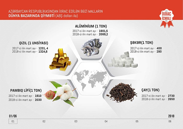 2017-ci ilin müvafiq dövrü ilə müqayisədə 2018-ci ilin I rübündə elektrik enerjisinin ixracı 8,6 dəfə, meyvə-tərəvəzin ixracı 45,7 faiz, qara metallar və onlardan hazırlanan məmulatların ixracı 34,8 faiz, kimya sənayesi məhsullarının ixracı 29,5 faiz, pambıq ipliyi ixracı 24,8 faiz, çayın ixracı 12,9 faiz, alüminium və ondan hazırlanan məmulatların ixracı 4 faiz artıb.