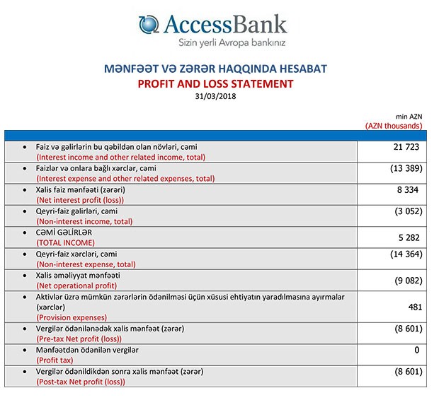 21 milyon 723 min manat gəlirə qarşı Bankın çıxarları 31 milyon 286 min manat təşkil edib. Lakin “AccesBank” ötən ilin 1-ci rübü ilə müqayisədə faiz və qeyri-faiz xərclərini azaltmağa nail olub. Ötən ilin ilk rübündə “AccesBank”ın 29 milyon 683 min manat faiz gəlirinə qarşı çıxarları 51 milyon 520 min manat təşkil etmişdi.