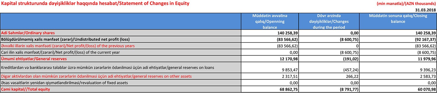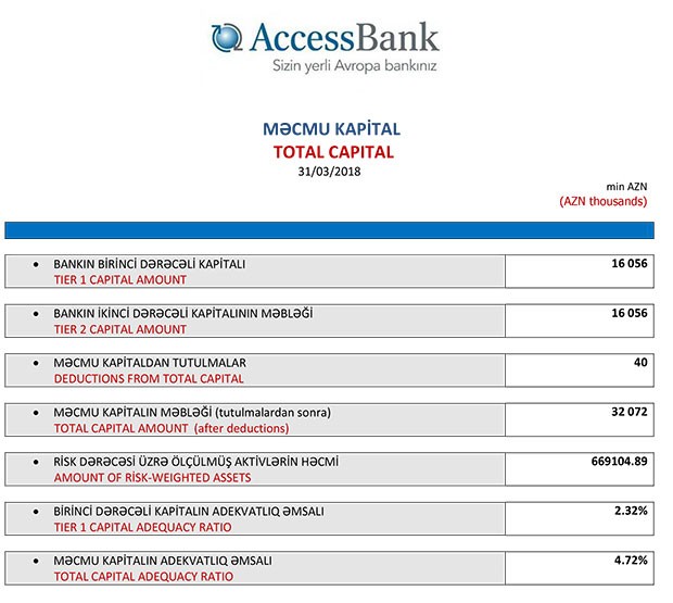 Zərər ilə əlaqədar olaraq “AccesBank”ın məcmu kapitalı 43 milyon 953 min manatdan 32 milyon 72 min manata düşüb. “AccesBank”ın yaxın zamanlarda kapitalının artırılacağı gözlənilir.