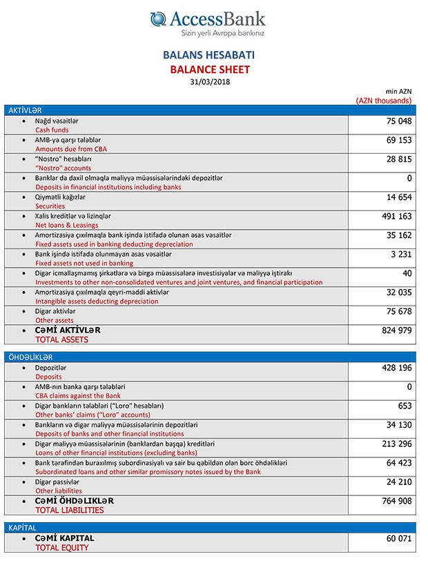 Son 3 ayda“AccesBank”ın müştərilərə verdiyi cəmi xalis kreditlərin məbləği ötən ilin sonundakı 503 milyon 503 min manatdan 31 Mart 2018-ci il tarixindək 491 milyon 163 min manata enib. Bank 31 Mart 2018-ci il tarixində 824 milyon 979 min manat cəmi aktivlərə malik olub. Bu rəqəm 2017-ci ilin sonunda 844 mlyon 821 min manat təşkil etmişdi.