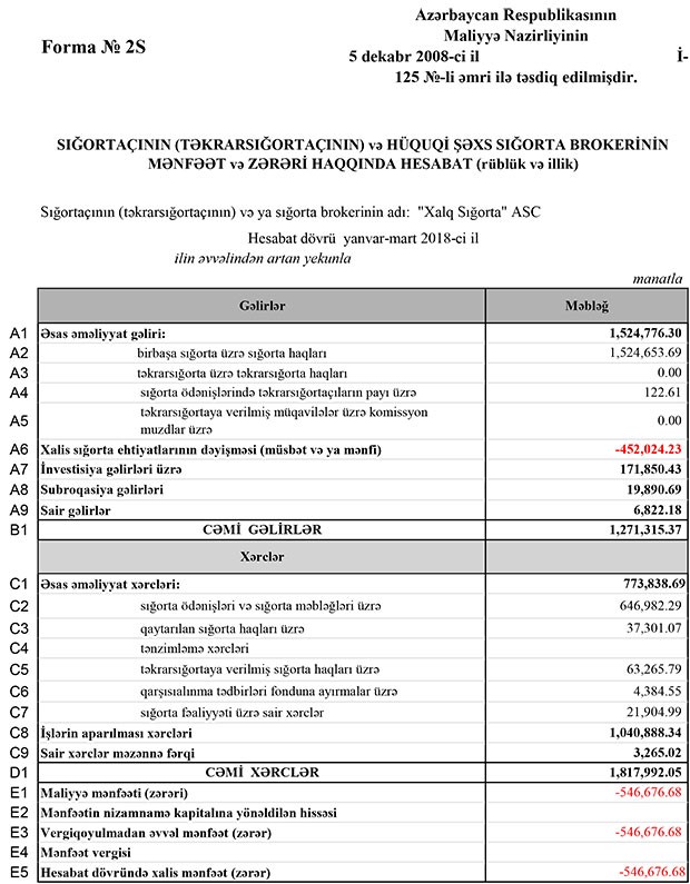 Ötən ilin ilk rübü ilə müqayisədə “Xalq Sığorta”nın topladığı sığorta haqları azaldığından və gəlirin 452 min manatı ehtiyata çevrildiyindən şirkətin zərəri yaranıb.