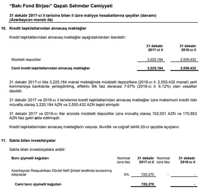 31 dekabr 2017 və 2016-cı illər ərzində müddətli depozitlər üzrə müvafiq olaraq 152,051 AZN və 170,853 AZN faiz gəliri əldə edilmişdir.