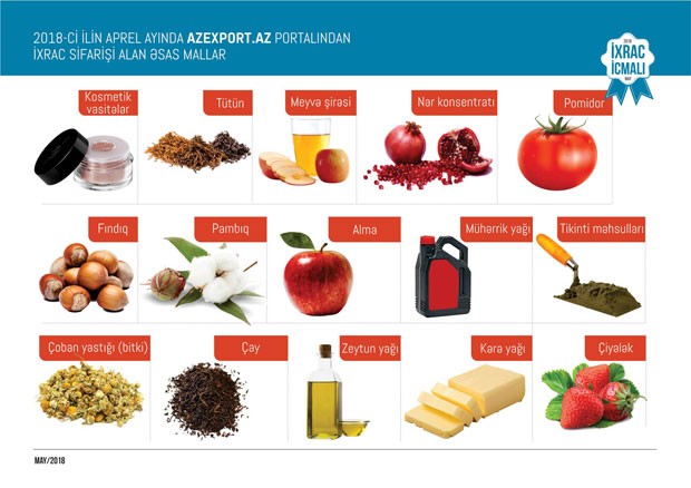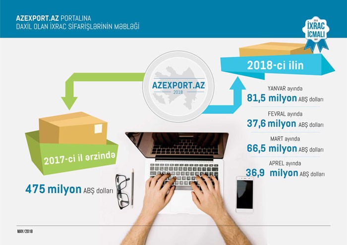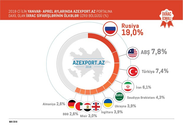 “İxrac İcmalı”nda 2018-ci ilin yanvar-aprel ayları ərzində Azexport.az portalına daxil olan ixrac sifarişləri barədə də məlumat verilib. Göstərilib ki, 2018-ci ilin aprel ayı ərzində Azexport.az portalına 36,9 milyon ABŞ dolları məbləğində ixrac sifarişləri daxil olub. Ümumilikdə isə 2017-ci ilin yanvar ayından 2018-ci ilin 30 aprel tarixinə kimi Azexport.az portalına dünyanın 93 ölkəsindən daxil olan ixrac sifarişlərinin dəyəri 697,5 milyon ABŞ dolları təşkil edib.