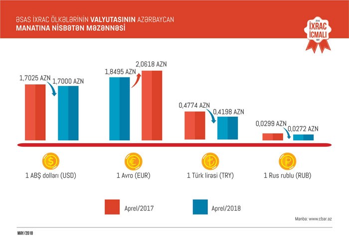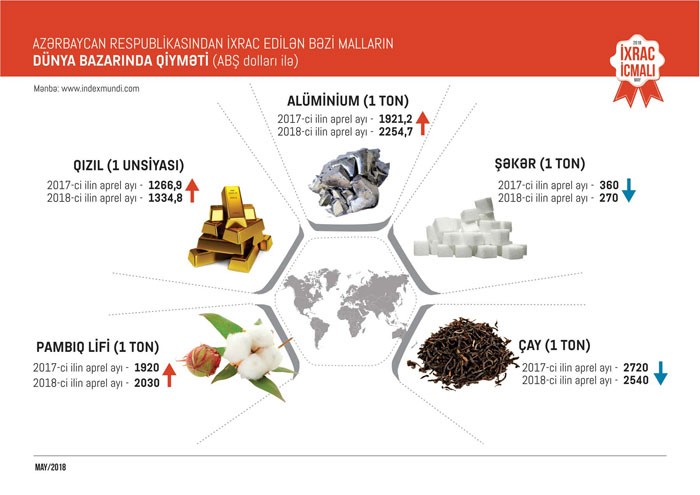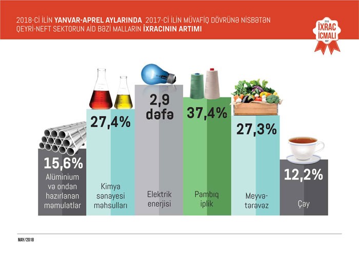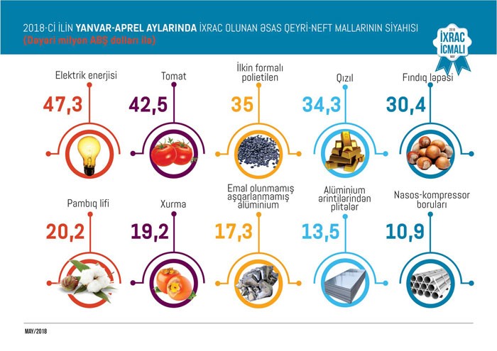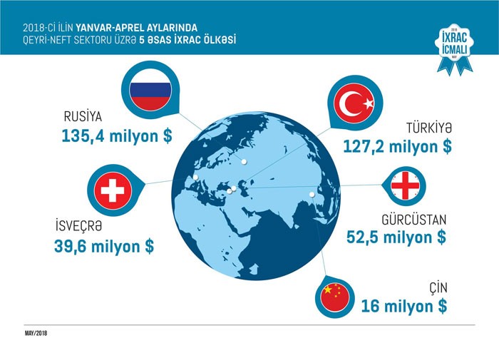İcmalın bu sayında göstərilir ki, 2018-ci ilin yanvar-aprel ayları ərzində qeyri-neft sektoru üzrə ixrac 485,3 milyon ABŞ dolları təşkil edib. 2017-cı ilin müvafiq dövrü ilə müqayisədə cari ilin yanvar-aprel aylarında qeyri-neft sektoru üzrə ixrac 19,3 faiz artıb. Cari ilin yanvar-aprel ayları ərzində Rusiya Federasiyasına 135,4 milyon, Türkiyəyə 127,2 milyon, Gürcüstana 52,5 milyon İsveçrəyə 39,6 milyon və Çinə 16 milyon ABŞ dolları dəyərində qeyri-neft sektoruna aid mal ixrac olunub.